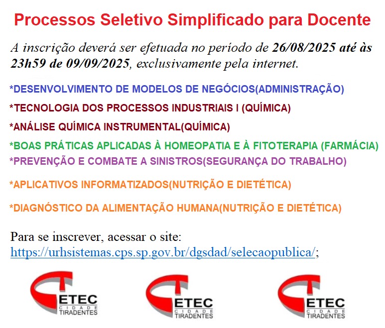 Estão abertas as inscrições para o processo seletivo simplificado para formação de da cadastro de docentes, para o função de professor de Ensino Médio e Técnico. Sua oportunidade para fazer parte do nosso quadro de professores, são muitas oportunidade em diferentes áreas de formação. Veja abaixo: